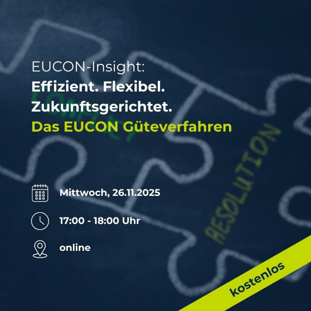 Insight Effizient. Flexibel. Zukunftsgerichtet. Das EUCON Güteverfahren Stefan Neuenhahn, Markus Englmeier Mittwoch, 26. November 2025 online Agenda 17:00 – 17:40 Uhr, Vorteile und Ablauf des Güteverfahrens 17:40 – 18:00 Uhr, Fragen und Diskussion Kerninhalte Einleitung des Verfahrens Ablauf des Verfahrens Häufige Fragen Das EUCON-Güteverfahren bietet eine schnelle und flexible Möglichkeit, Konflikte außergerichtlich zu lösen. Auf […]