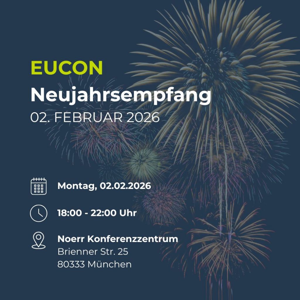 EUCON Neujahrsempfang Montag, 02. Februar 202618:00 – 22:00 UhrMünchen Am 02. Februar 2026 veranstalten wir unseren jährlichen Neujahrsempfang und laden Sie herzlich ein mit uns in München ins neue Jahr zu starten! Ab 18:00 Uhr empfangen wir Sie im Noerr Konferenzzentrum in München. Nach einem kurzen Rück- und Ausblick durch unseren Vorstandsvorsitzenden freuen wir uns […]