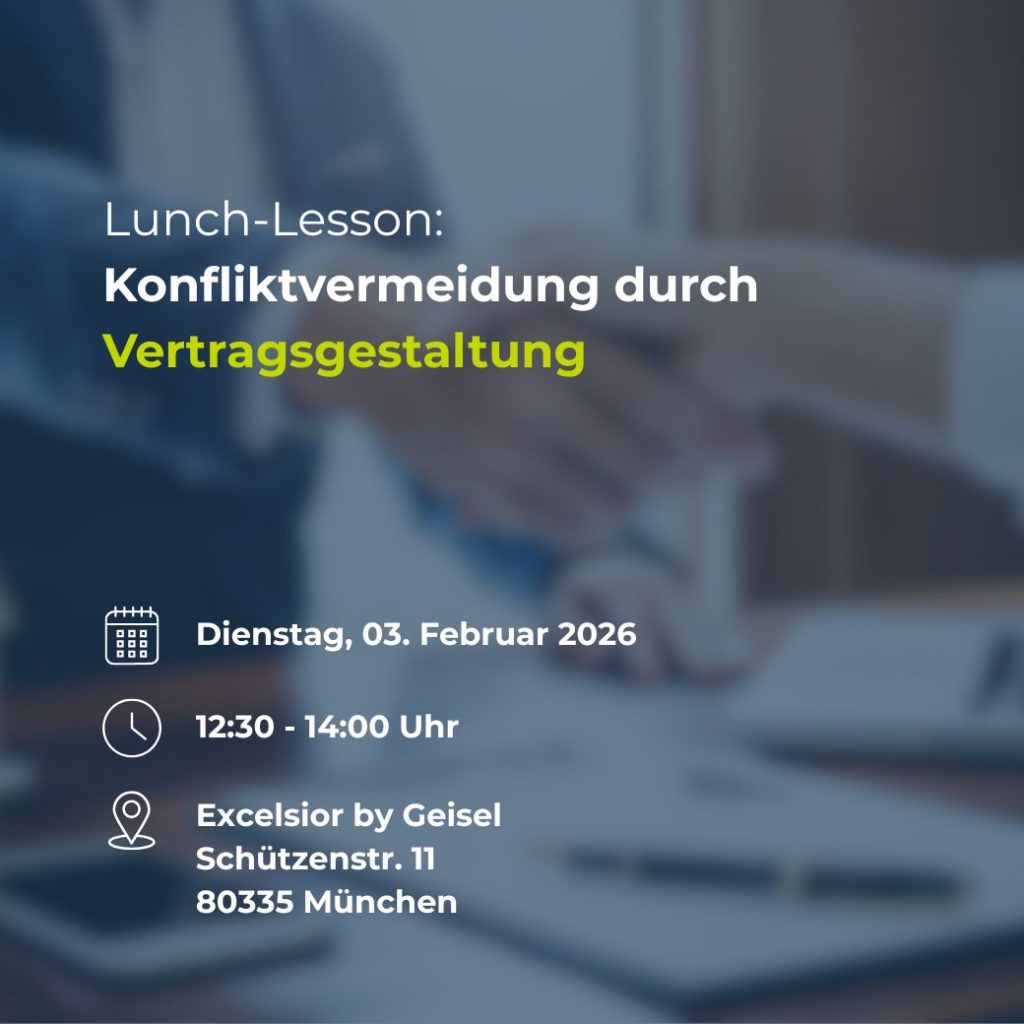 Lunch Lesson Konfliktvermeidung durch Vertragsgestaltung Dr. Ulrich Hagel Dienstag, 03. Februar 2026 München In dieser Lunch-Lesson erhalten die Teilnehmenden während des gemeinsamen Essens kompakte Impulse zur Bedeutung moderner Vertragsgestaltung und wirksamer Konfliktlösungsklauseln – praxisnah, verständlich und ideal für eine inspirierende Mittagspause. Inhalt des Workshops Vertragslayout: klassisch und/oder ansprechend Vertragssprache: klar und verständlich Vertragsvisualisierung: Bilder sagen […]